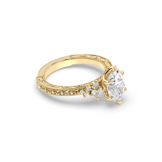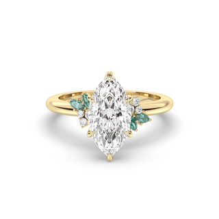 Rose Ring, Latticework Petal Prongs, Teal Moissanite Leaves, Marquise Cut