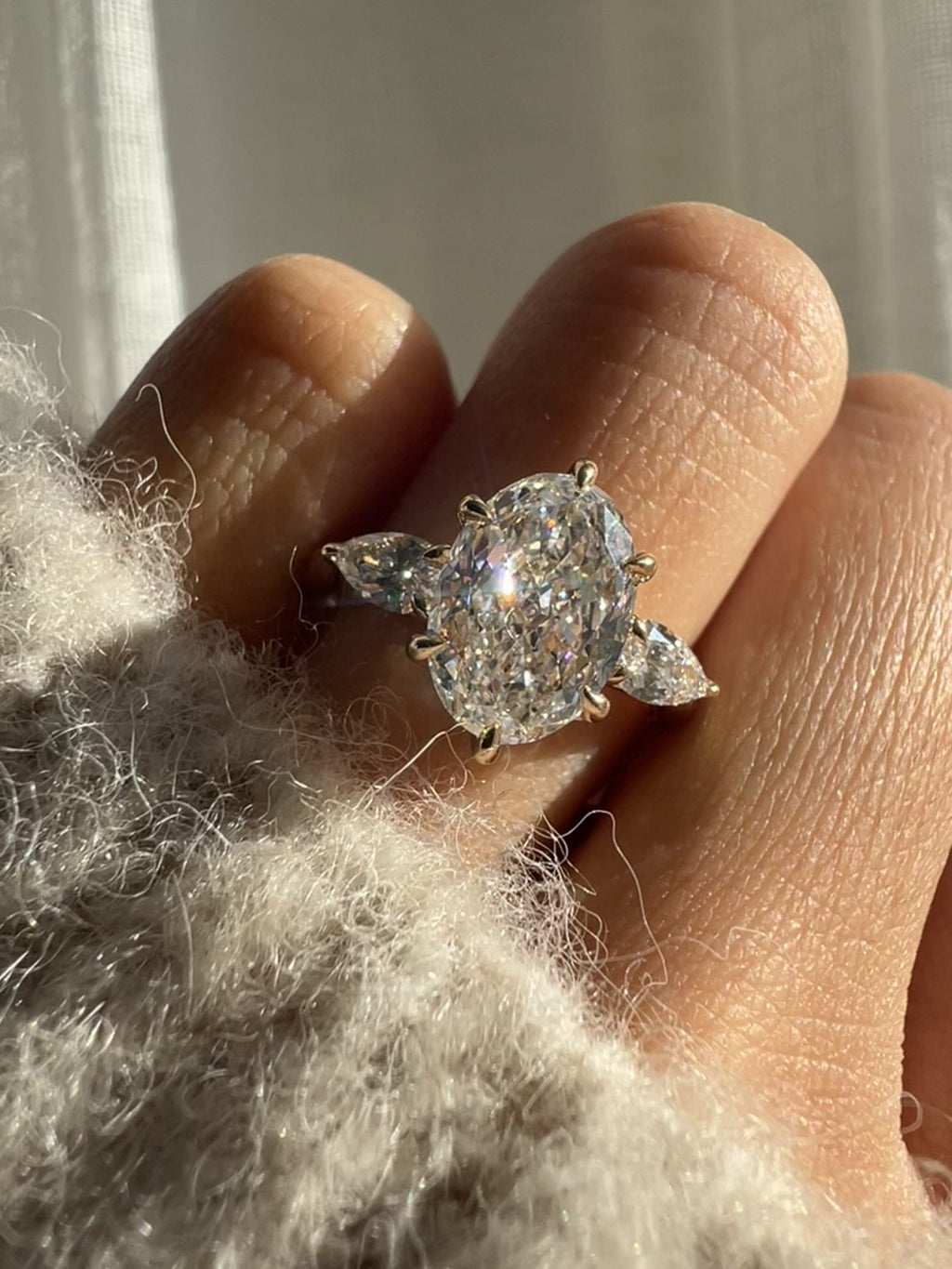 The oval rests within our beloved Latticework Petal Prongs; a romantic bloom of petals that weaves around the center stone. Petal prongs encapsulate the two pear diamonds that frame the center.