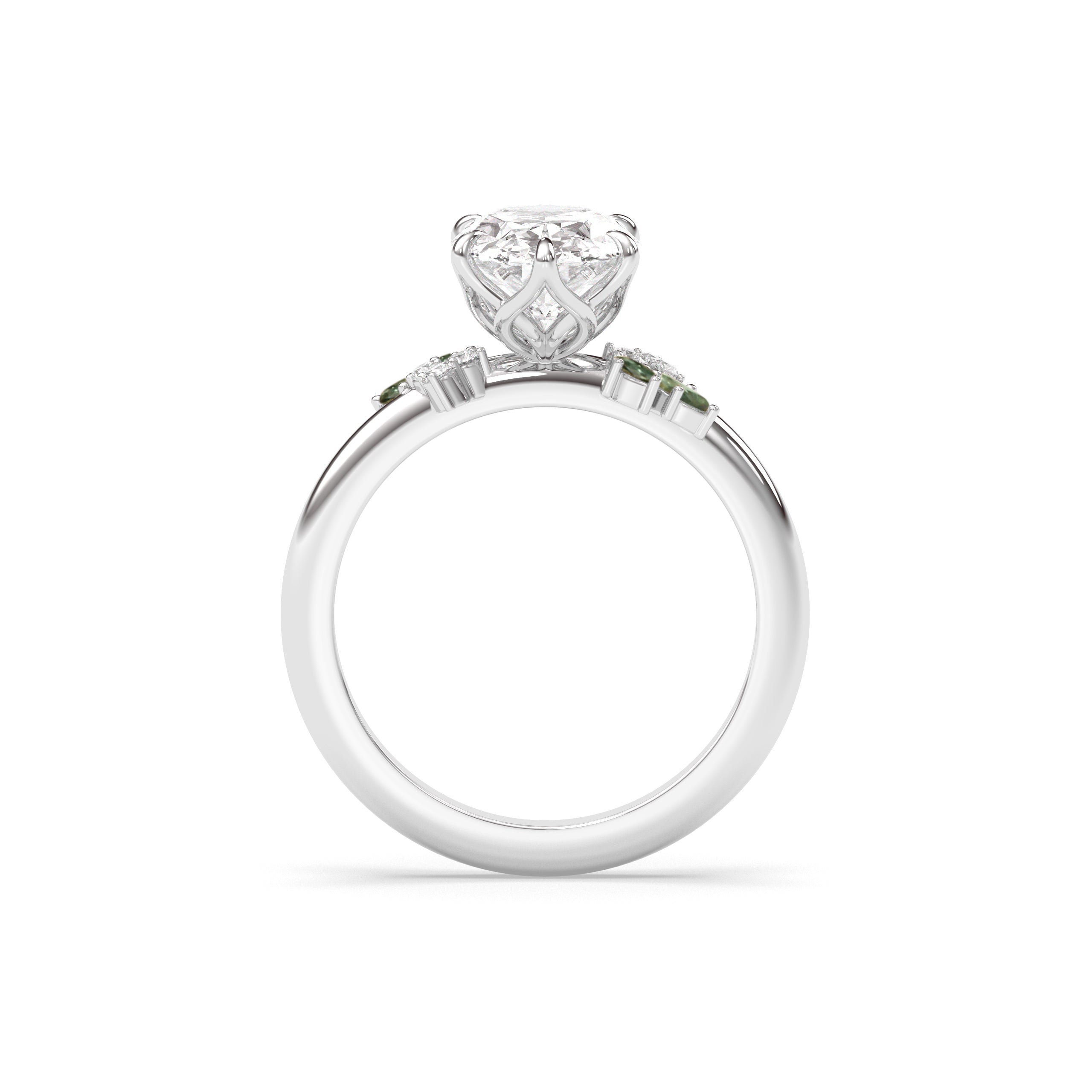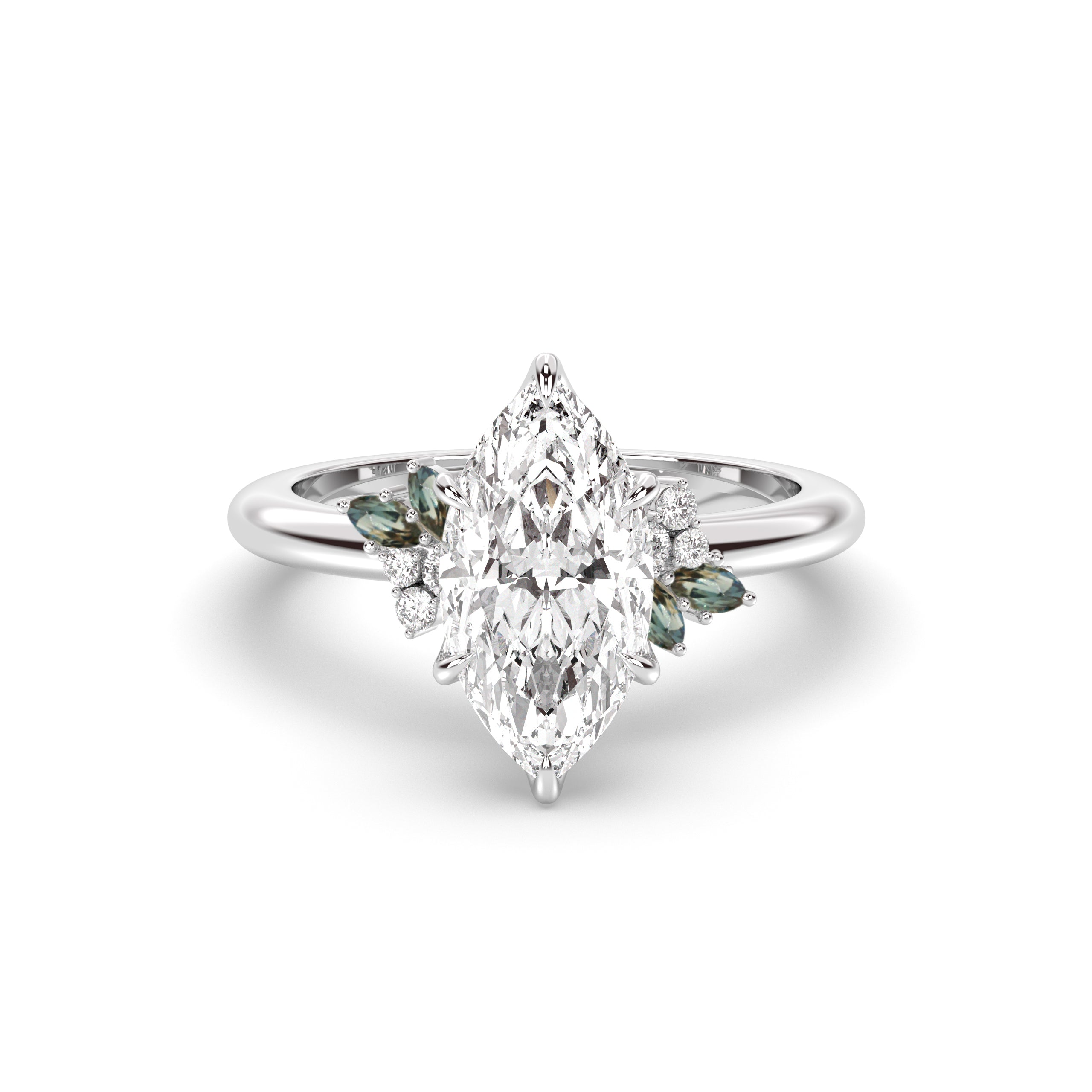 Around the center stone, teal Australian lab sapphire leaflets and colorless baby's breath softly bloom around the heart of this nature-inspired ring.