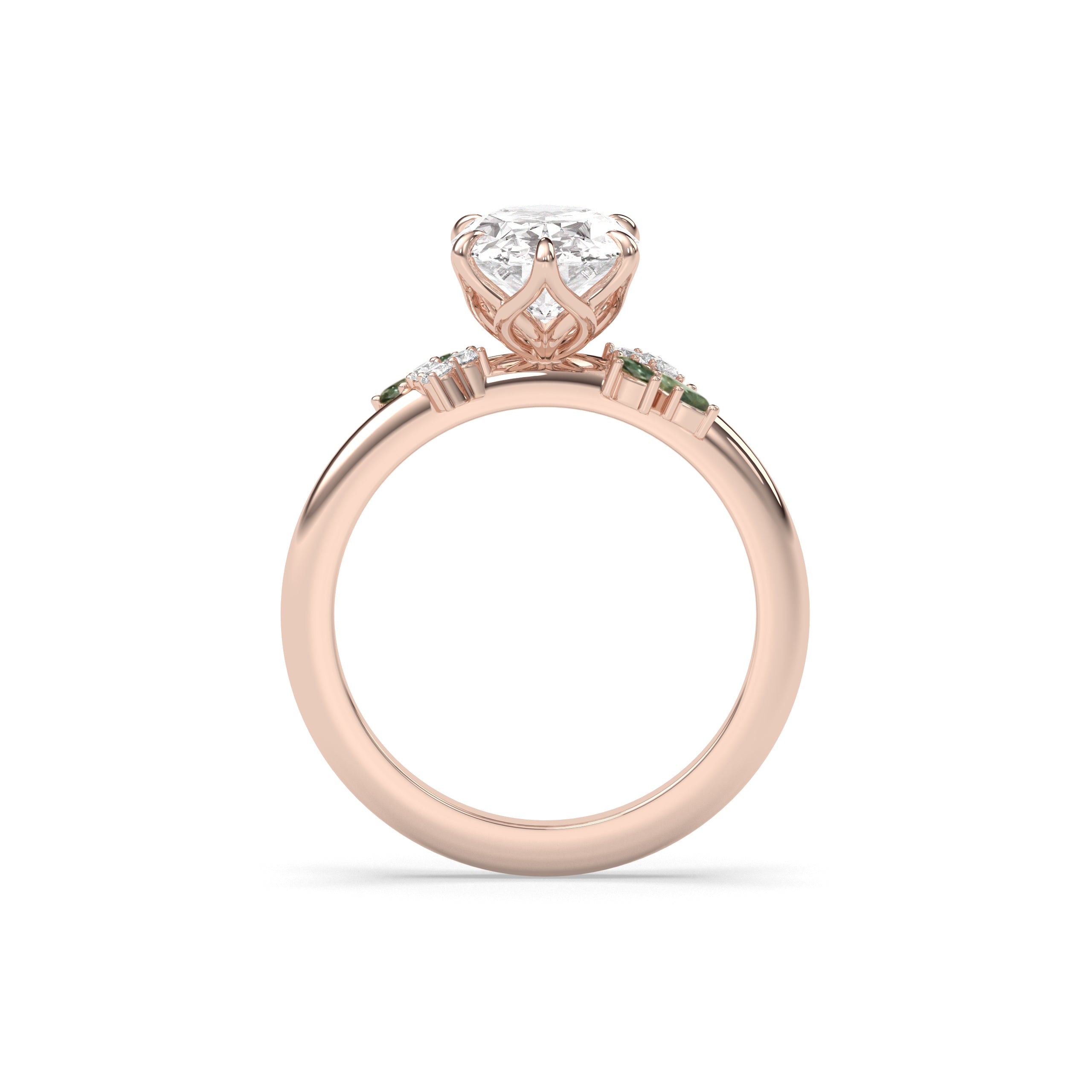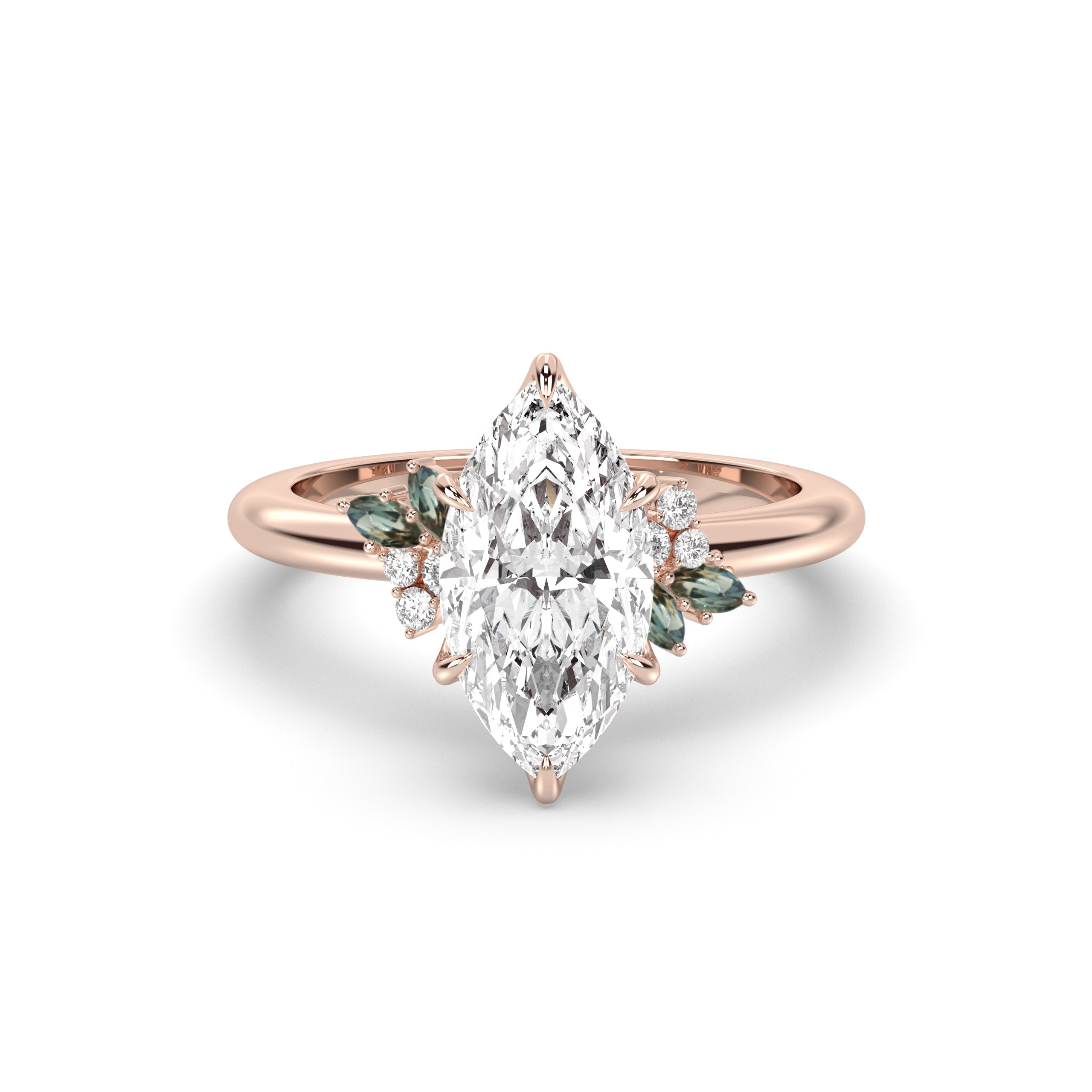 Rose Ring, Latticework Petal Prongs™, Australian Teal Sapphire Leaves, Marquise Cut