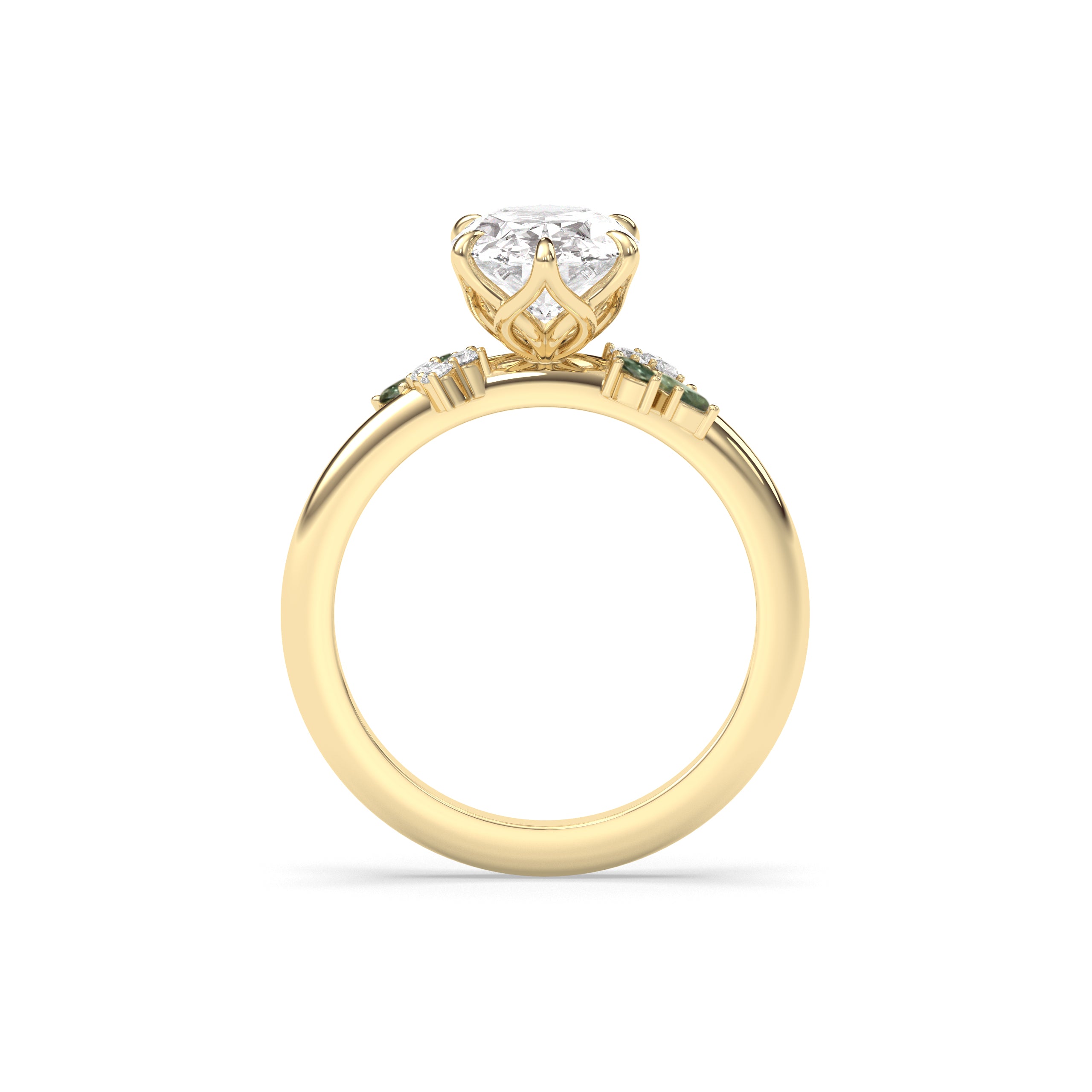 Non-round side stones in all rings are lab diamond.