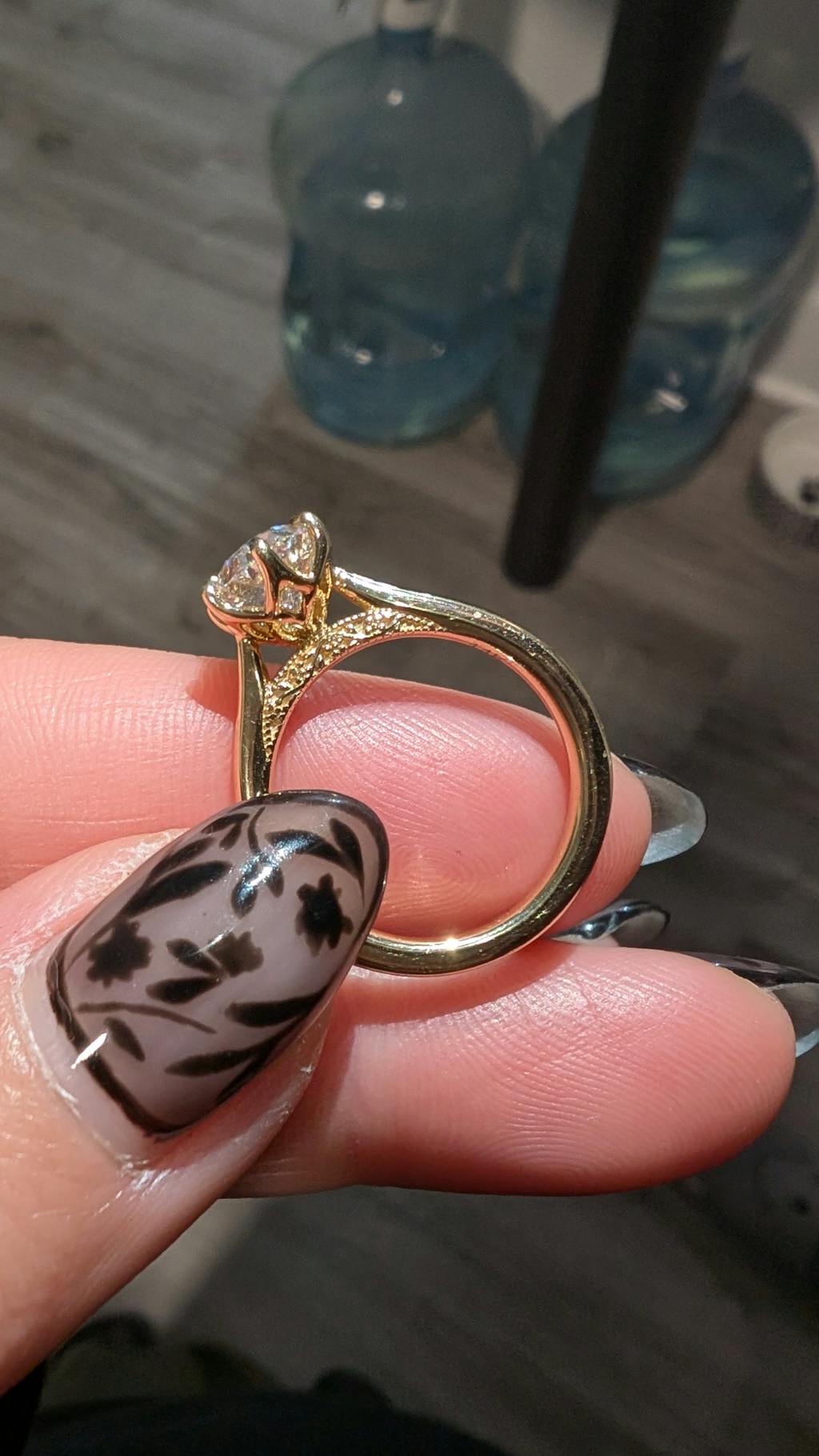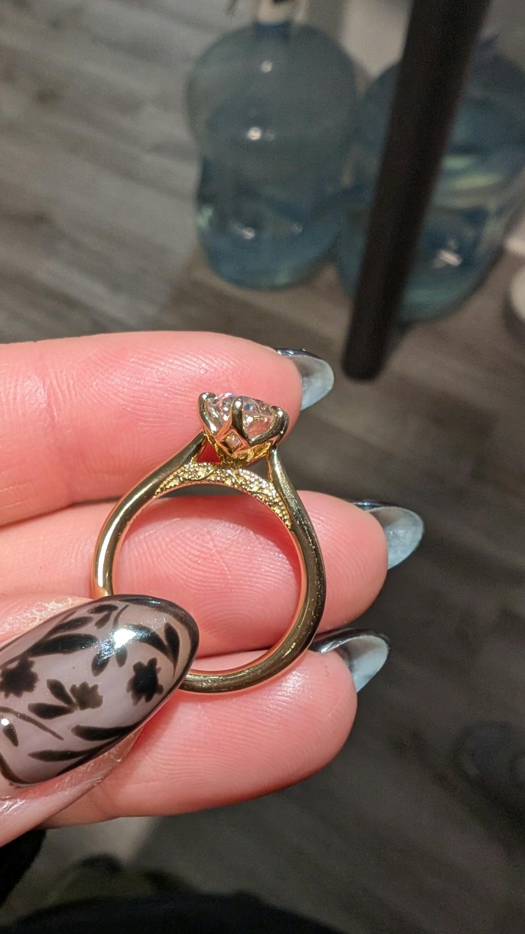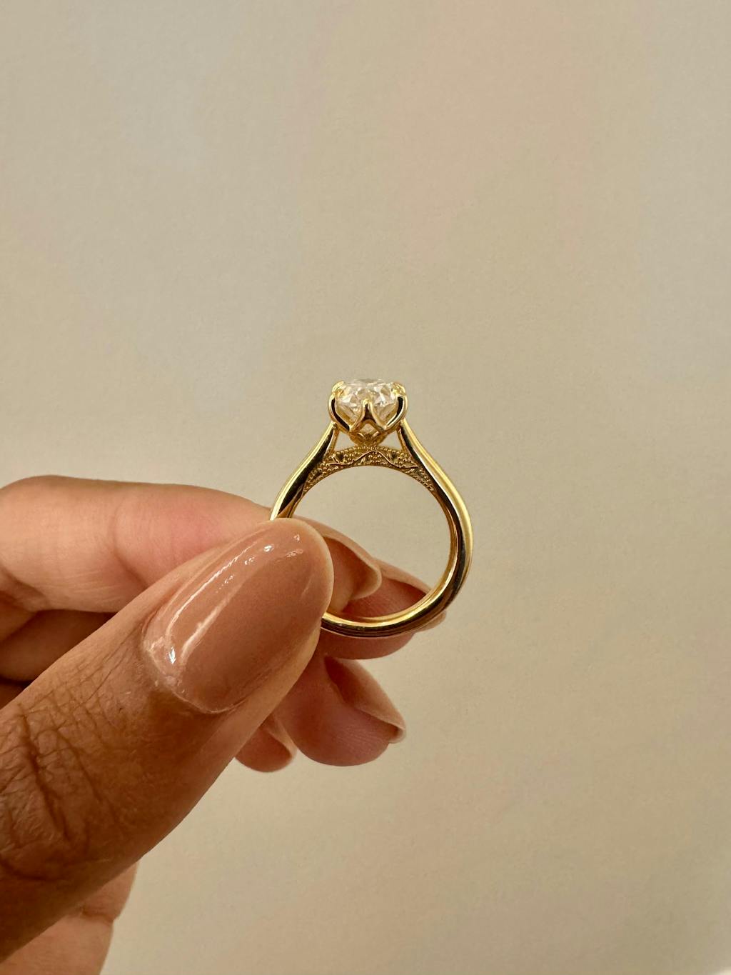 All of our ring purchases include an expert curation service where our founder and diamond expert, Michelle, hand selects the ideal diamond to ensure that it meets the highest standards for excellence. The diamond is selected for the exact setting that it is going into, with regards to a multitude of factors including but not limited to: the diamond cuts proportions, the number of prongs, prong placement, setting style, ring size, band width, and the presence or absence of side stones. Our stones are always custom cut in very strict balanced ratios; if you have specific diamond requirements you'd like to have met, please reach out to us via email!