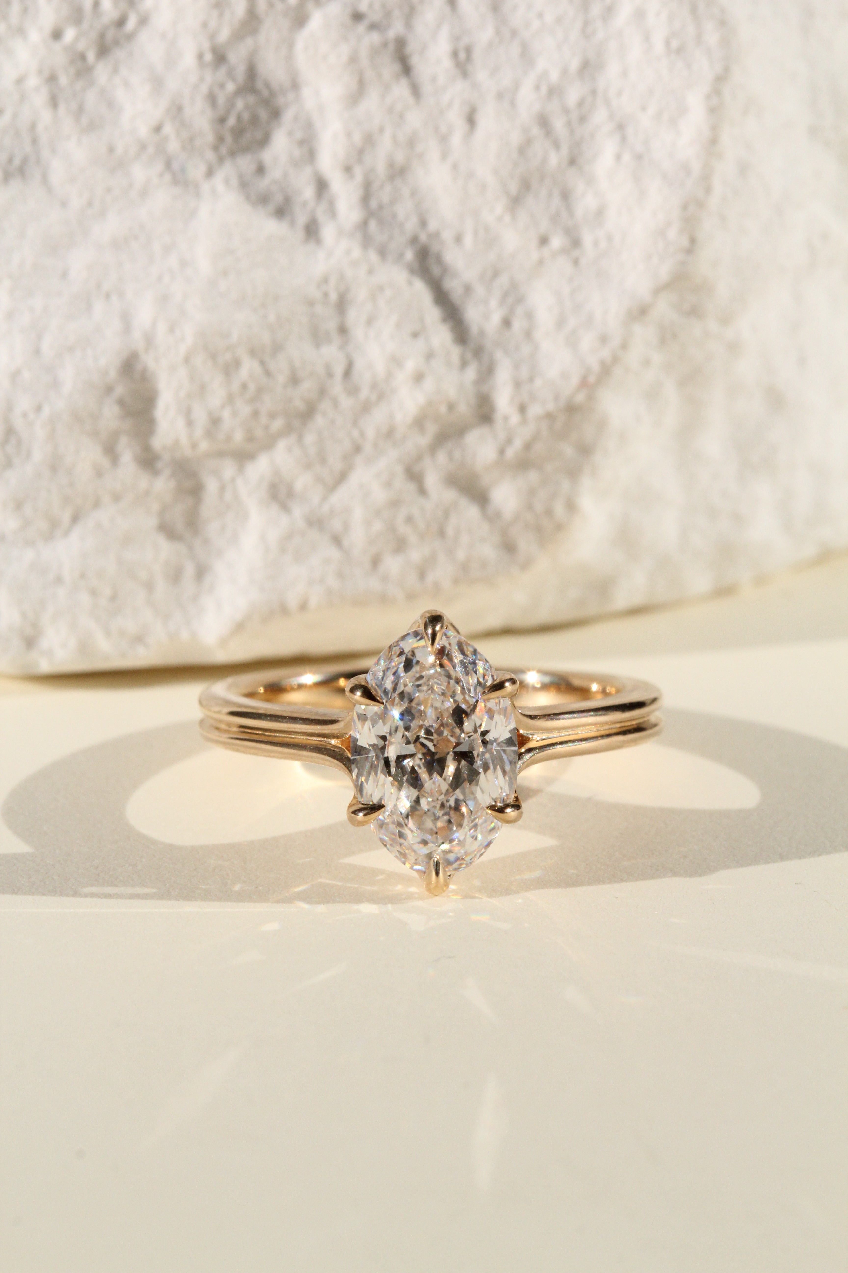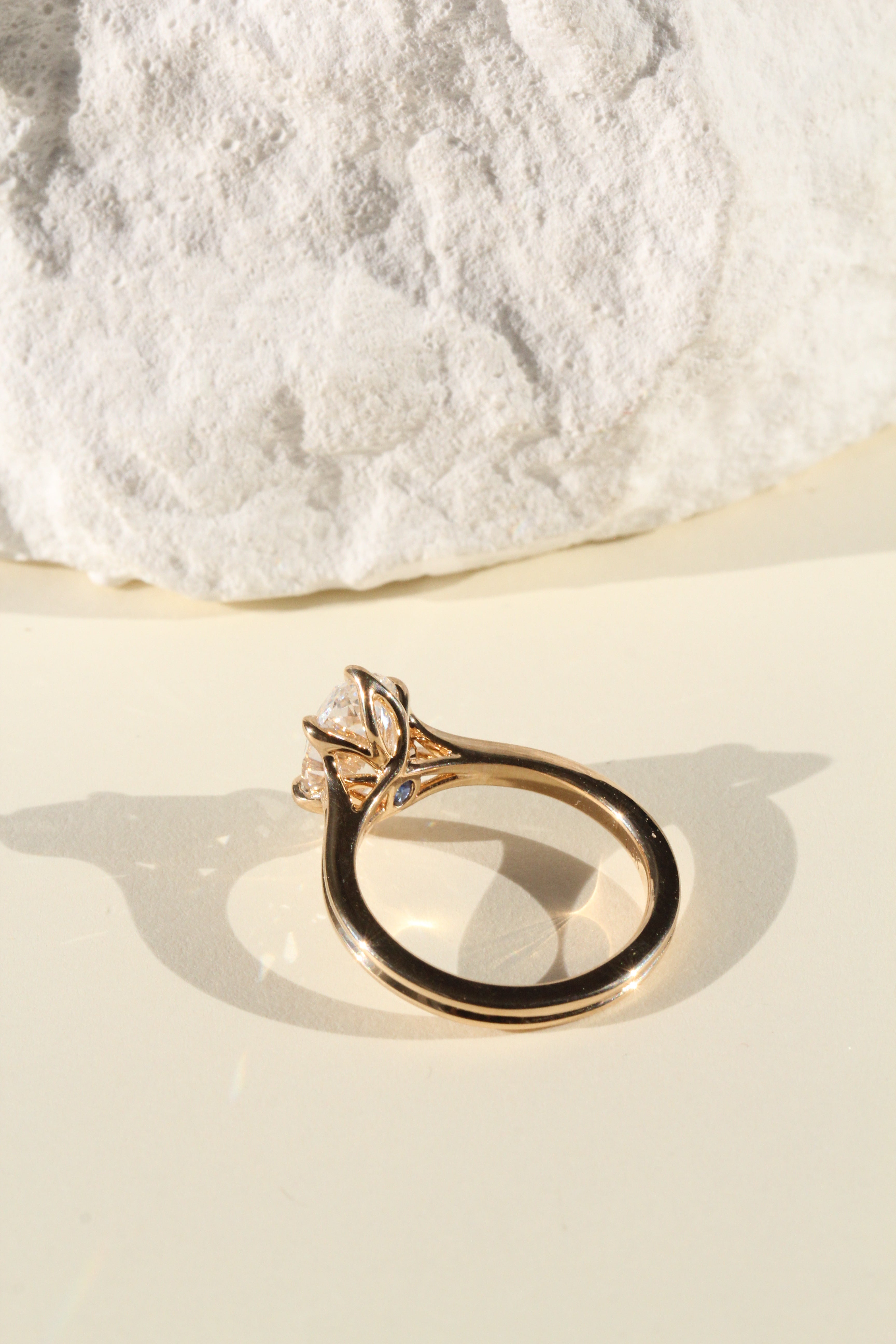All of our ring purchases include an expert curation service where our founder and diamond expert, Michelle, hand selects the ideal diamond to ensure that it meets the highest standards for excellence. The diamond is selected for the exact setting that it is going into, with regards to a multitude of factors including but not limited to: the diamond cuts proportions, the number of prongs, prong placement, setting style, ring size, band width, and the presence or absence of side stones. Our stones are always custom cut in very strict balanced ratios; if you have specific diamond requirements you'd like to have met, please reach out to us via email!